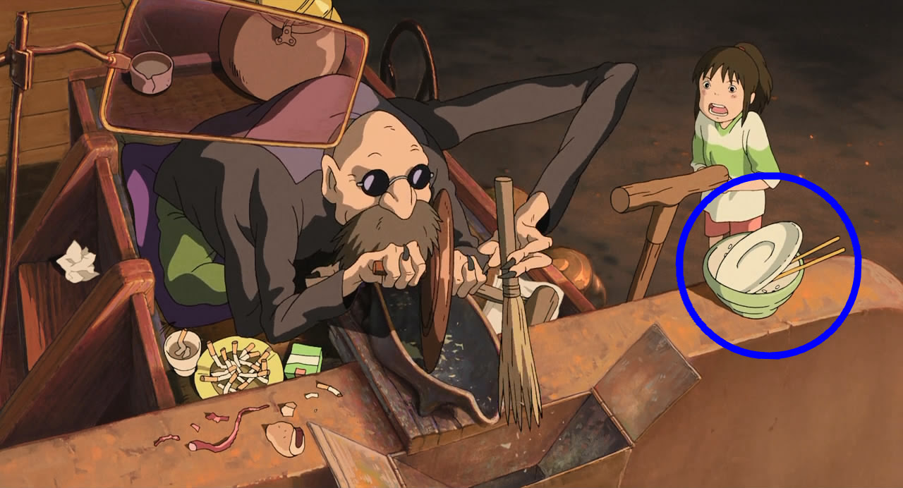 1.會飛的筷子在電影23分鐘的時候,鍋爐爺爺猛敲桌子,把筷子從碗裡震掉了出來。