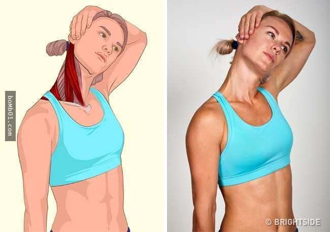 後背挺直,左手放在右耳附近,慢慢向左歪頭,試著用左耳碰左肩。拉伸完畢後換另一邊。